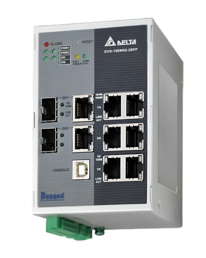 Switch Ethernet industrial DVS series, modelo DVS-108W02-2SFP marca Delta Electronics.